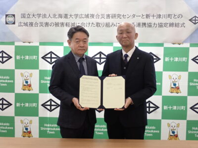 このたび、北海道大学広域複合災害研究センターと新十津川町が相互に連携し、洪水や地震等に起因する広域複合災害の防災・減災対策に資する研究活動や地域住民等への防災に関する啓発活動を円滑に実施していくため、連携協力協定を締結いたしました。