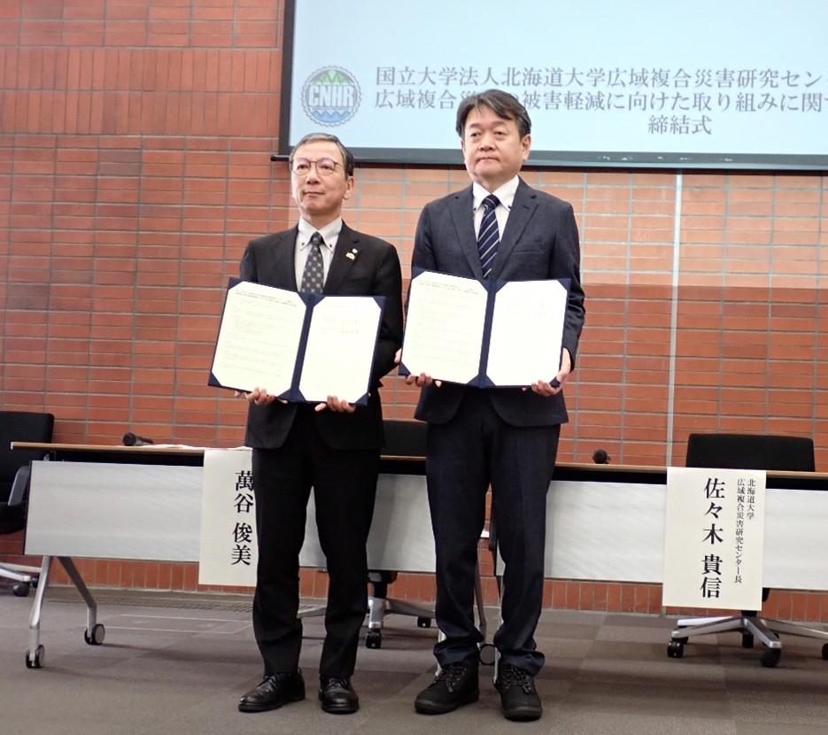 このたび、北海道大学広域複合災害研究センターと八雲町が相互に連携し、巨大地震等に起因する広域複合災害の防災・減災対策に資する取り組みや専門的知識を有する人材の育成などを推進することで広域複合災害の被害軽減を図るため、連携協力協定を締結いたしました。